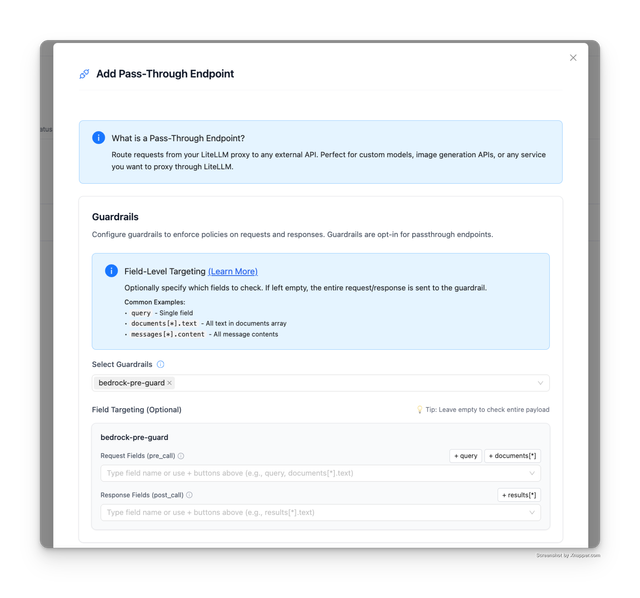 You can configure guardrails on pass-through endpoints either via the UI (recommended) or config file.